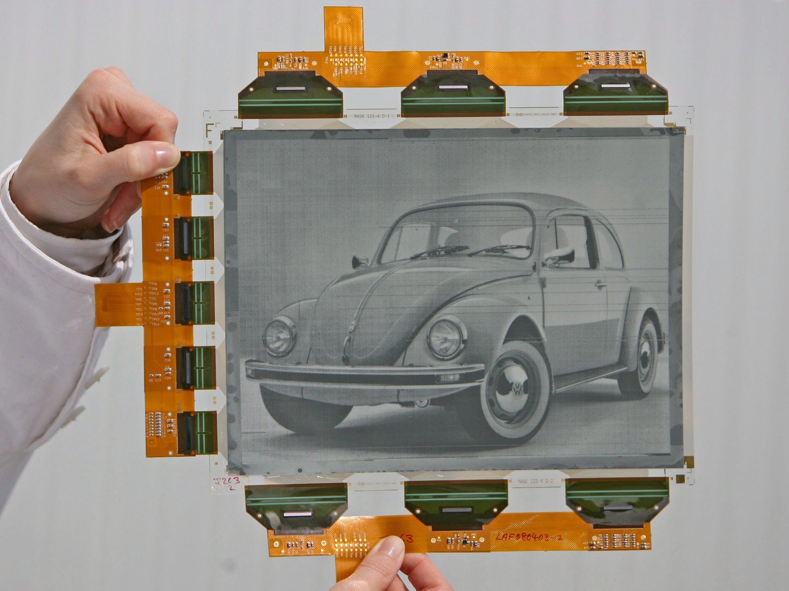 Una empleada de la empresa británica Plastic Logic muestra un prototipo de un periódico electrónico en la planta de producción de esta compañía en Dresde, Alemania, hoy, miércoles 10 de septiembre. Este aparato puede reproducir periódicos, libros electrónicos y revistas, así como documentos en formatos .doc ó pdf., según datos facilitados hoy en una rueda de prensa. Está previsto que empiece a comercializarse en el primer semestre del año 2009. Esta empresa ya presentó un prototipo de estas características en el año 2005. EFE/Ralf Hirschberger.