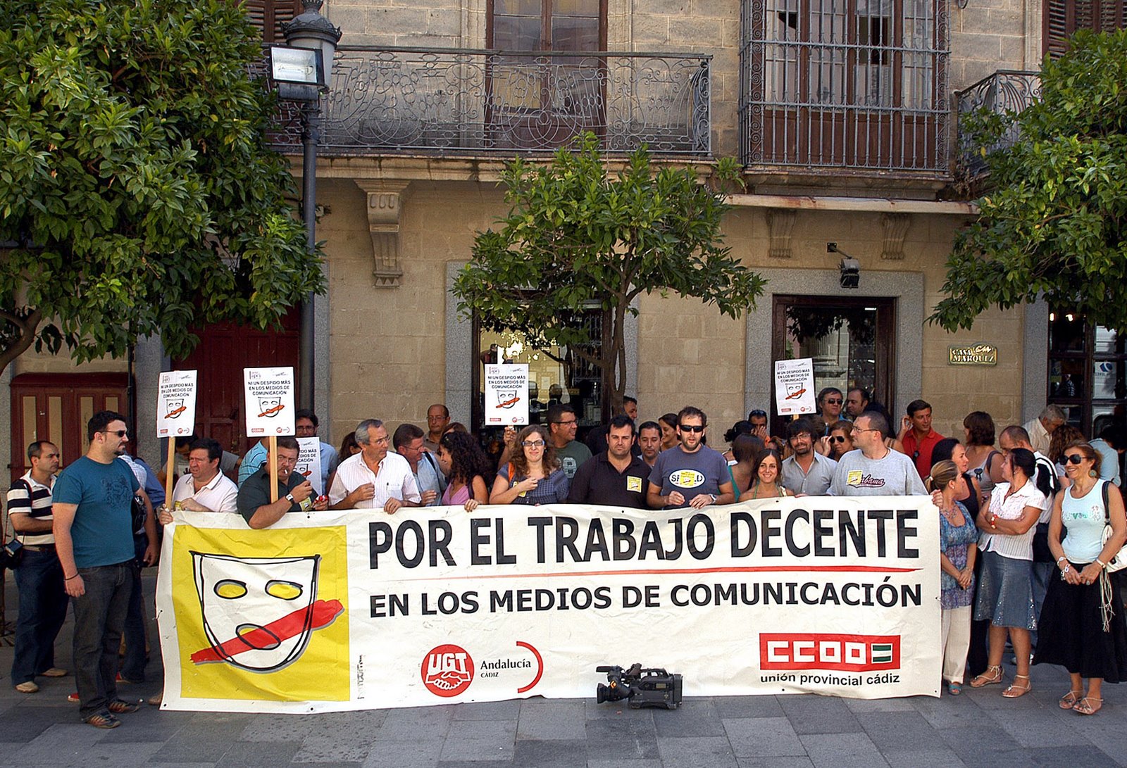 La concentración de esta mañana ha servido para denunciar a la opinión pública la dramática situación por la que atraviesan los trabajadores de los medios de comunicación, así como para recalcar la exigencia que los profesionales de los medios realizaron a todos los partidos políticos de la Corporación jerezana: que se inste a la Consejería de Empleo y a la Inspección de Trabajo a que tomen medidas para extremar la vigilancia del fraude en los despidos; que se fiscalicen las nuevas contrataciones eventuales que se están produciendo, así como el empeoramiento de las condiciones de trabajo por las reducciones de plantilla.