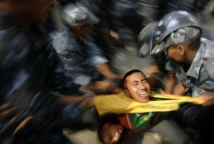 Y eligió Nepal. Las protestas le pillaron incrustado entre los monjes budistas. La fotografía ganadora le pilló en un momento de gran confusión. Morenatti explicó así la instantánea: «Hay un momento en que tú formas parte de ese embrollo. Uno intenta salir pero ya está metido en el follón. Pasa delante mío. y aprovechas. Pones la velocidad para dar efecto a la foto y disparas».