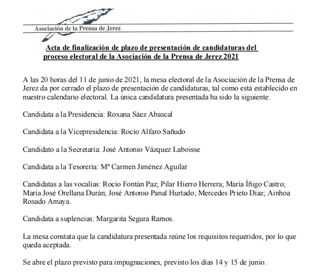 El plazo para presentar impugnaciones a la candidatura estará abierto hasta los días 14 y 15 de junio. Para presentarla pueden escribir un mail a asociacionprensajerez@jerez.es.
