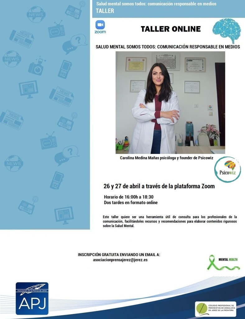 La Asociación de la Prensa de Jerez organiza un taller online sobre “salud mental somos todos: comunicación responsable en medios”. Se celebrará los días 26 y 27 de abril en horario de tarde de 16.00 a 18.30 horas a través de la plataforma Zoom. Esta nueva actividad formativa será impartida por Carolina Medina psicóloga, Ceo y founder de Psicoweiz.