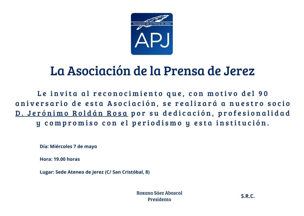 La Asociación de la Prensa de Jerez (APJ) celebra, el próximo 7 de mayo, en la sede del Ateneo de Jerez, a las 19.00 horas, el acto de homenaje al periodista jerezano Jerónimo Roldán, una de las figuras más representativas del periodismo local y andaluz, en el marco del 90 aniversario de la institución.